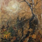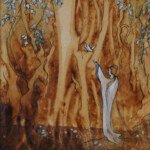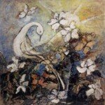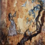 Evangeline’s experimentation with other media was primarily rooted in painting but she frequently would blend collage, particularly tissue paper collage, when she worked in watercolour and acrylic medium. She loved the accidental events that happened in front of her and delighted in seeing what she could see in a design once the ‘messy part’ of the painting had dried. Much of her fantasy work began in this way.